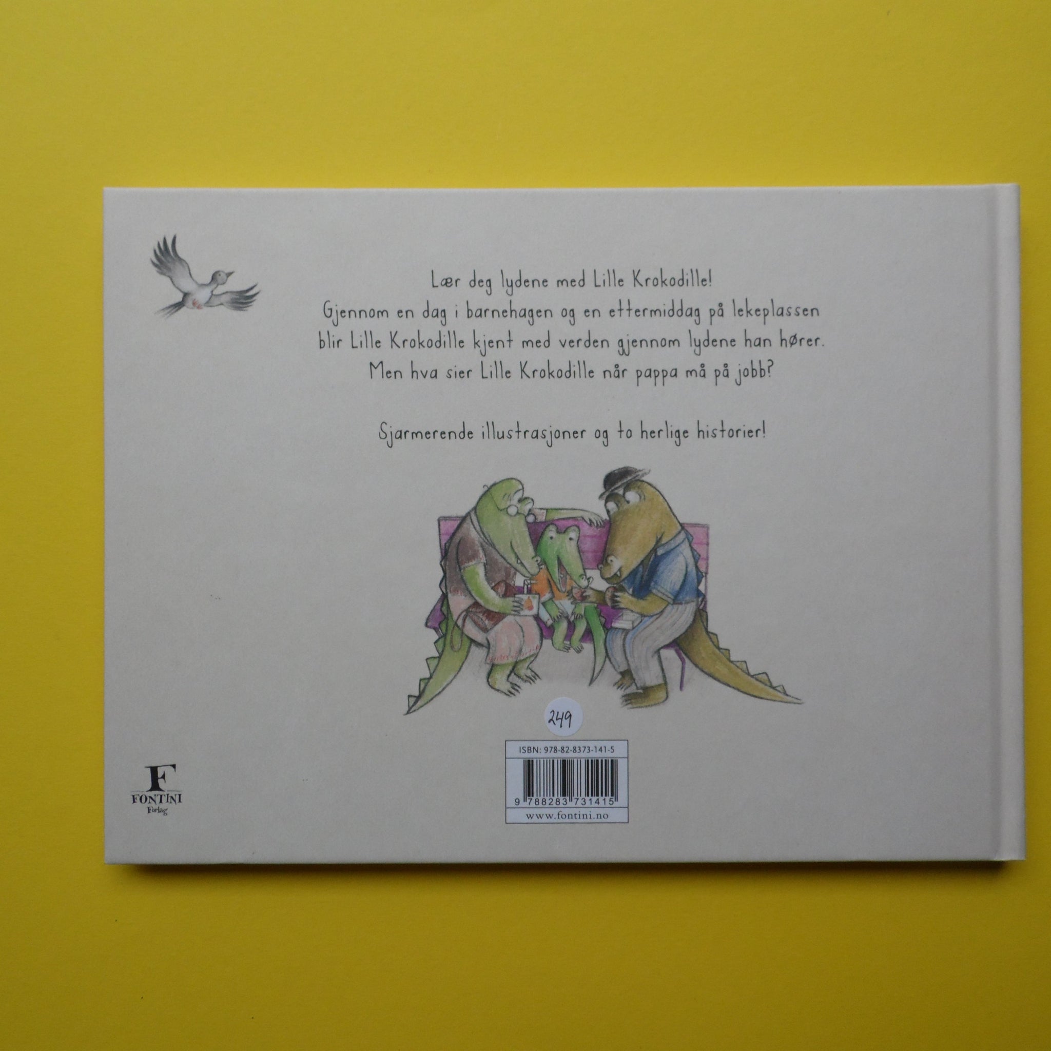 Gjennom en dag i barnehagen og en ettermiddag på lekeplassen blir Lille Krokodille kjent med nye personer og miljøer gjennom lydene han hører. La barna ta del i høytlesingsstunden ved å etterlikne lydene og gjøre seg kjent med situasjonene som oppstår. For det er mange ting Lille Krokodille skal kjenne på for første gang, blant annet separasjonsangst når pappa leverer i barnehagen, evnen til å måtte dele med andre, og den litt skumle opplevelsen av å møte nye venner. Boka inneholder to sjarmerende historier om Lille Krokodille. Flott gavebok!