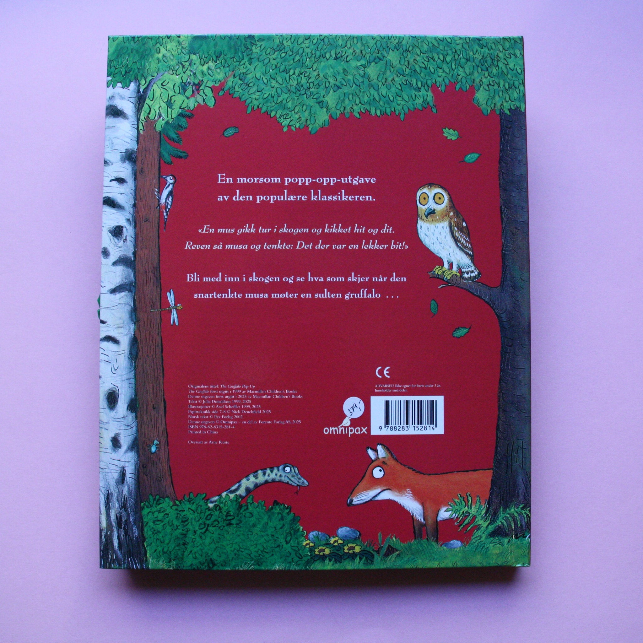Gavebok i stort format med sider i kartong og elementer som popper opp når du blar om. Boka inneholder hele den populære fortellingen om Gruffalo.