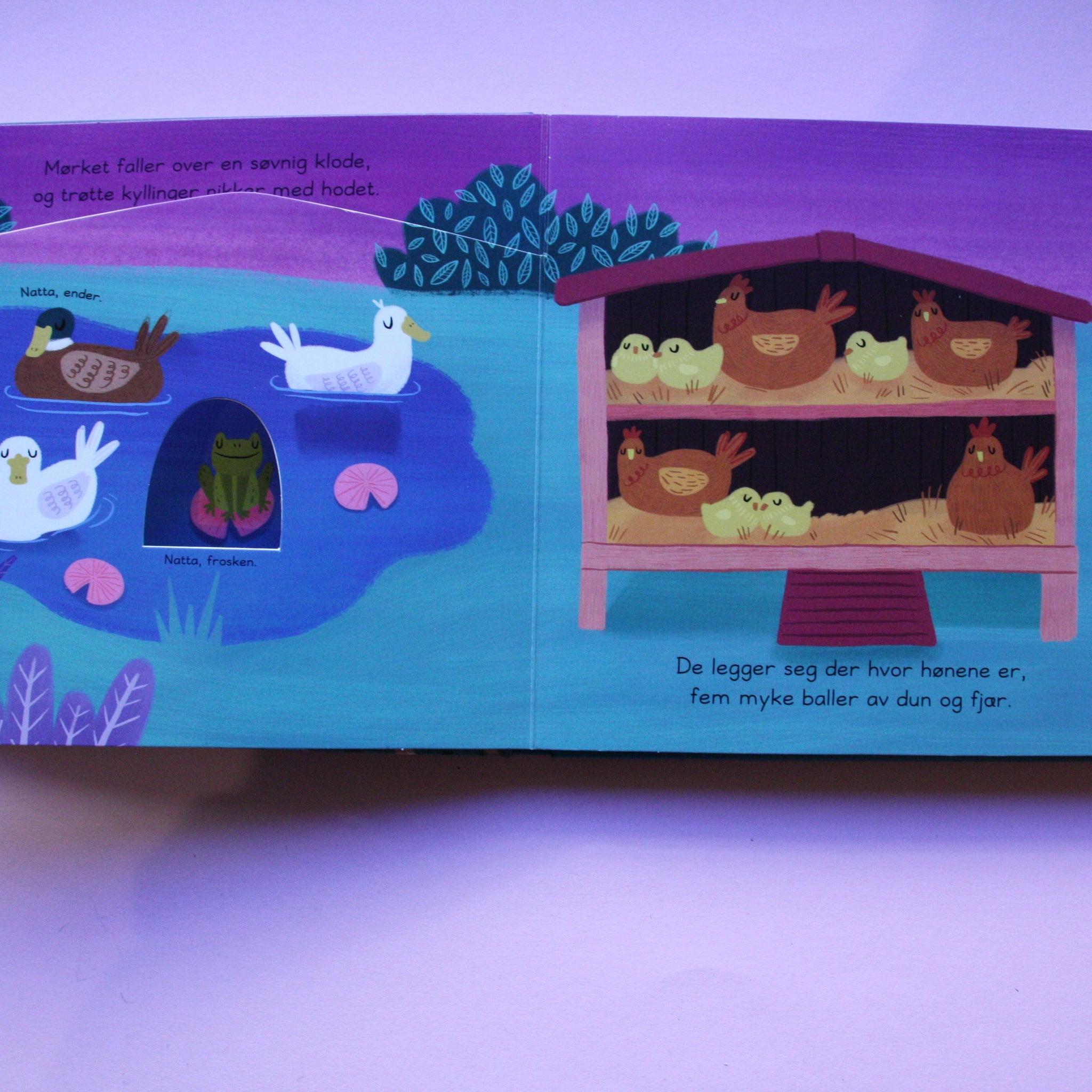Når boka er slutt og det er på tide å si god natt, kan dere slukke lyset og se stjernene skinne i mørket. (Husk å lade opp stjernene på det siste oppslaget i boken ved å holde sidene under en lampe i 30 sekunder.) Slitesterk bok i papp.